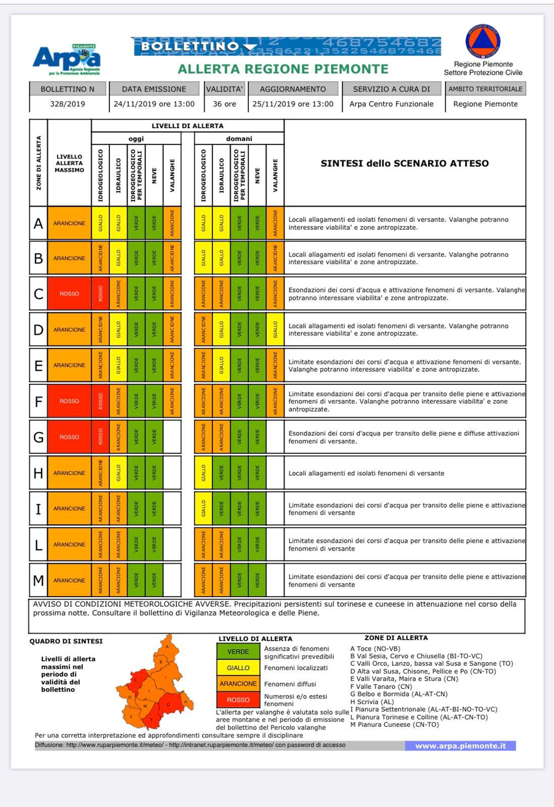 Bollettino di allerta meteo della Regione Piemonte emesso domenica 24 novembre 2019 alle ore 13,00.