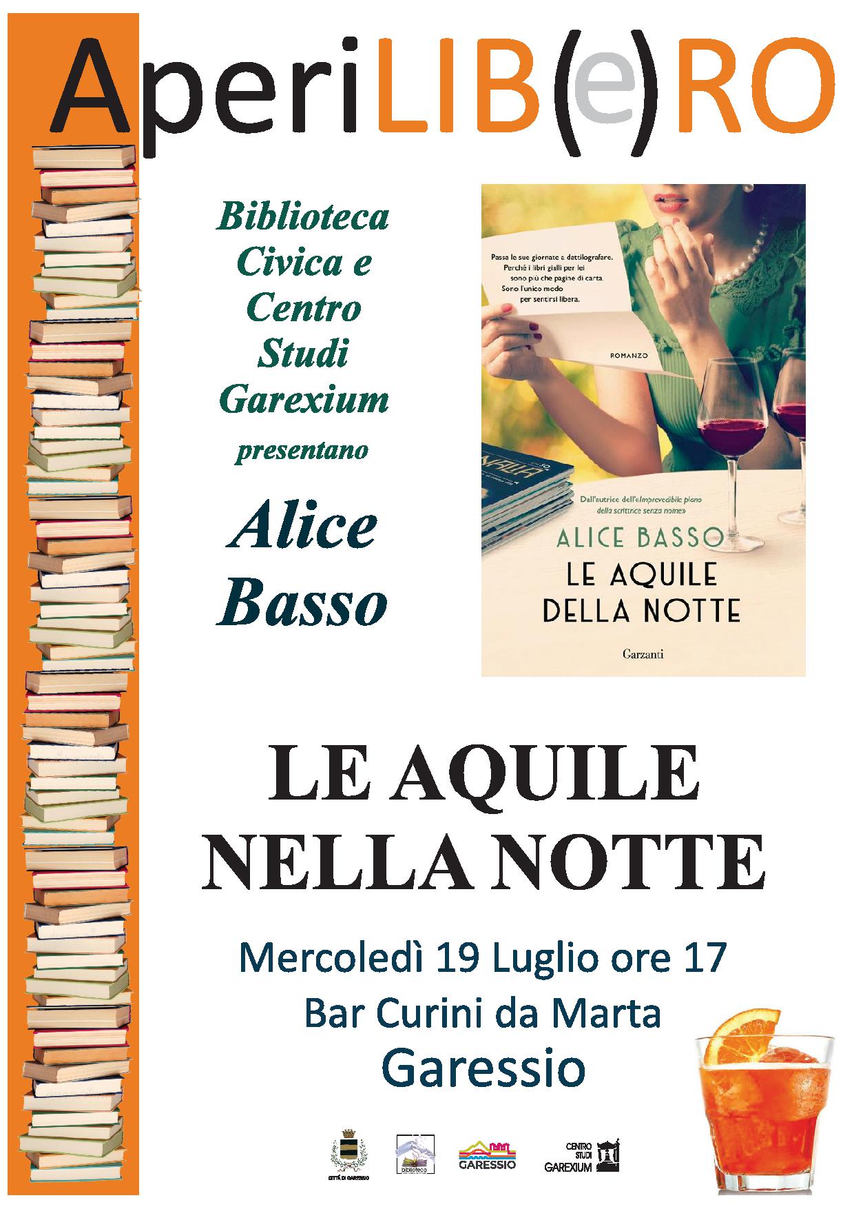 Mercoledì 19 luglio 2023, alle ore 17,00, presso il Bar Curini - da Marta, nell’ambito di AperiLIB(e)RO, la Biblioteca Civica e il Centro Studi Garexium, presentano il libro di Alice Basso: “Le aquile nella notte”.