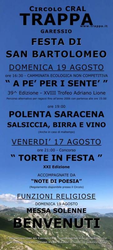 Domenica 19 agosto 2018, a Trappa, alle ore 16,30 si svolgerà la camminata ecologica non competitiva “A pé per i senté” ed alle ore 19,00 polenta saracena, salsiccia, birra e vino.