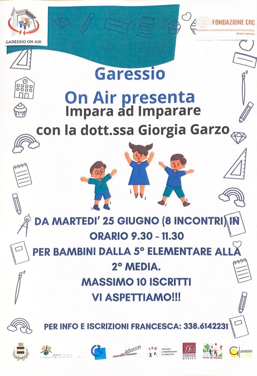 Da martedì 25 giugno 2024, presso Villa Gobbi, dalle 9,30 alle 11,30 si svolgeranno 8 incontri per bambini dalla 5^ elementare alla 2^ media con la dott.ssa Giorgia Garzo.