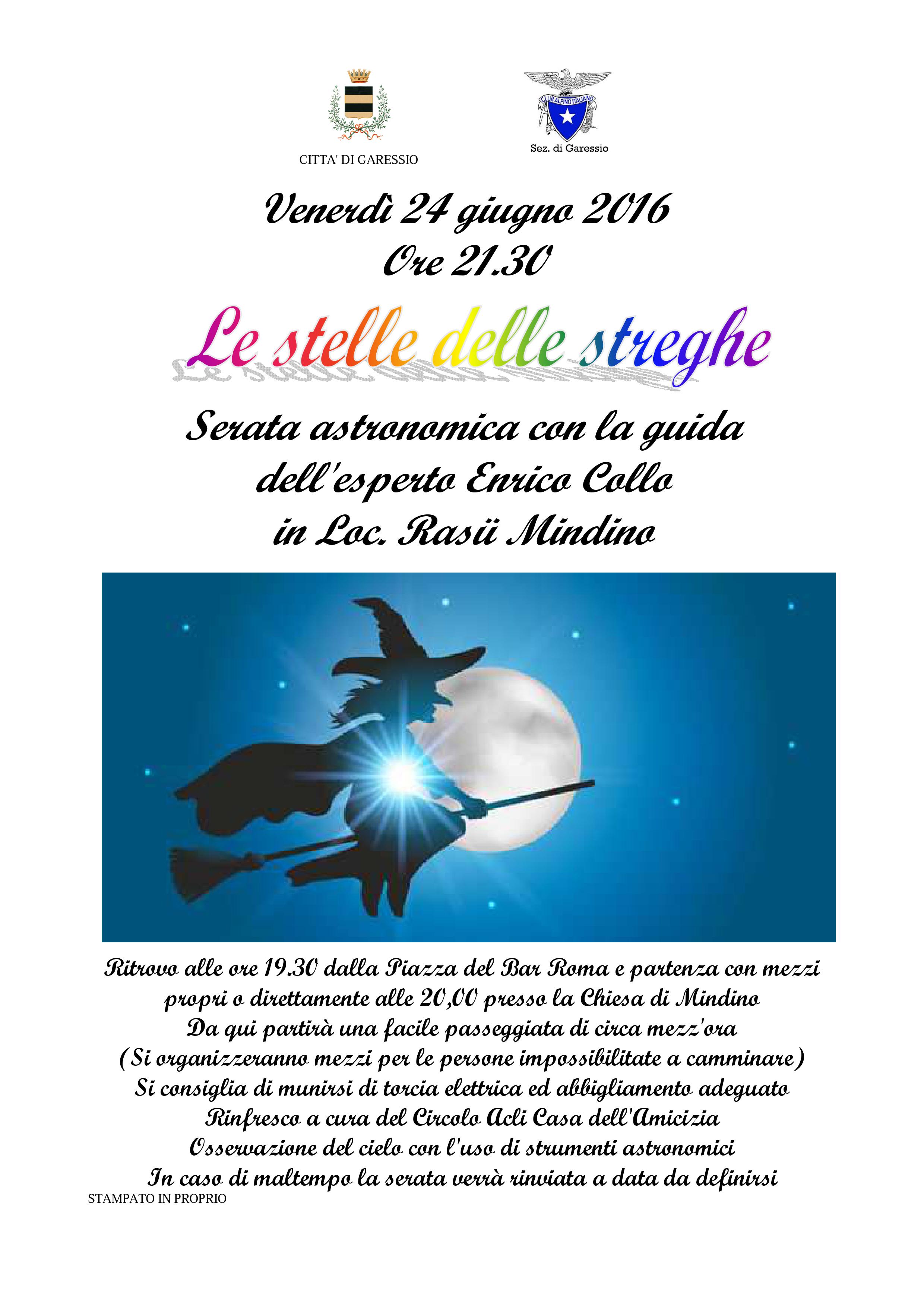 Venerdì 24 giugno 2016 alle ore 21.30 in loc. Rasü Mindino si svolgerà "Le stelle delle streghe", una serata astronomica con la guida dell'esperto Enrico Collo.