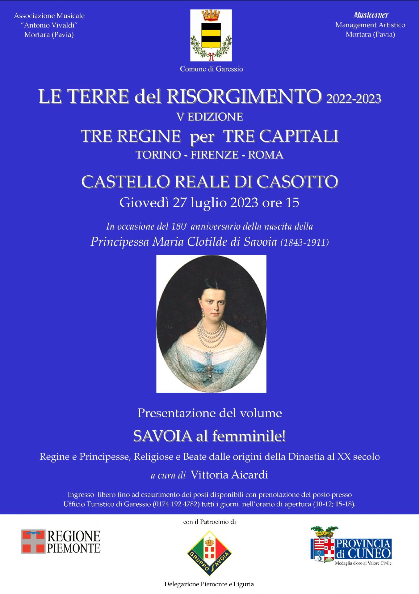 Giovedì 27 luglio 2023, alle ore 15,00, presso il Castello Reale di Casotto, in occasione del 180° anniversario della nascita della Principessa Maria Clotilde di Savoia, presentazione del volume "Savoia al femminile! Regine e Principesse, Religiose e Beate dalle origini della Dinastia al XX secolo". A cura di Vittoria Aicardi. Ingresso su prenotazione.