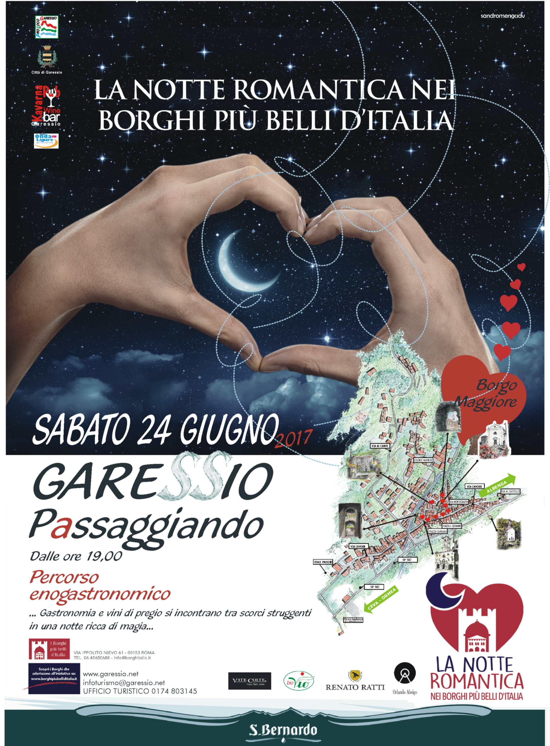 Sabato 24 giugno 2017 a partire dalle ore 19,00 presso il Borgo Maggiore si svolgerà la "Notte romantica nei Borghi più belli d'Italia" - Garessio Passaggiando, un percorso enogastronomico in cui gastronomia e vini di pregio si incontrano in una notte ricca di magia.