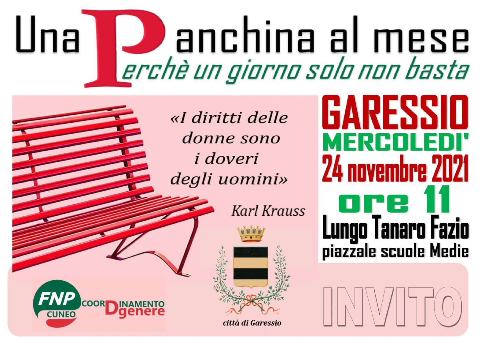 Mercoledì 24 novembre 2021 alle ore 11,00 presso il Lungo Tanaro Fazio - Piazzale Scuole Medie verrà inaugurata la panchina rossa, simbolo della violenza sulle donne.