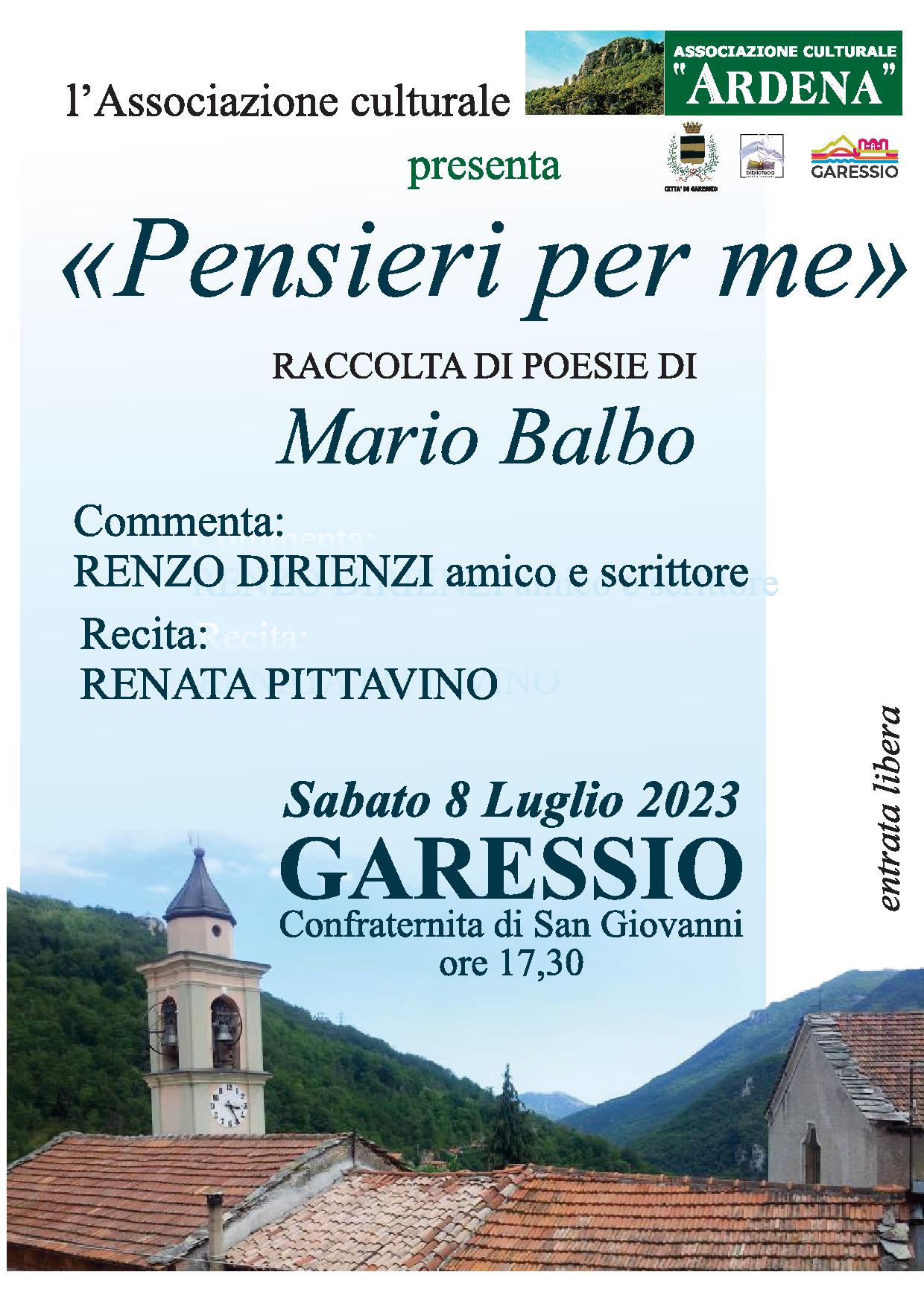 Sabato 8 luglio 2023, alle ore 17,30, presso la Confraternita di San Giovanni, nel Borgo Medievale, l'Associazione Culturale Ardena, presenta "Pensieri per me", di Mario Balbo.