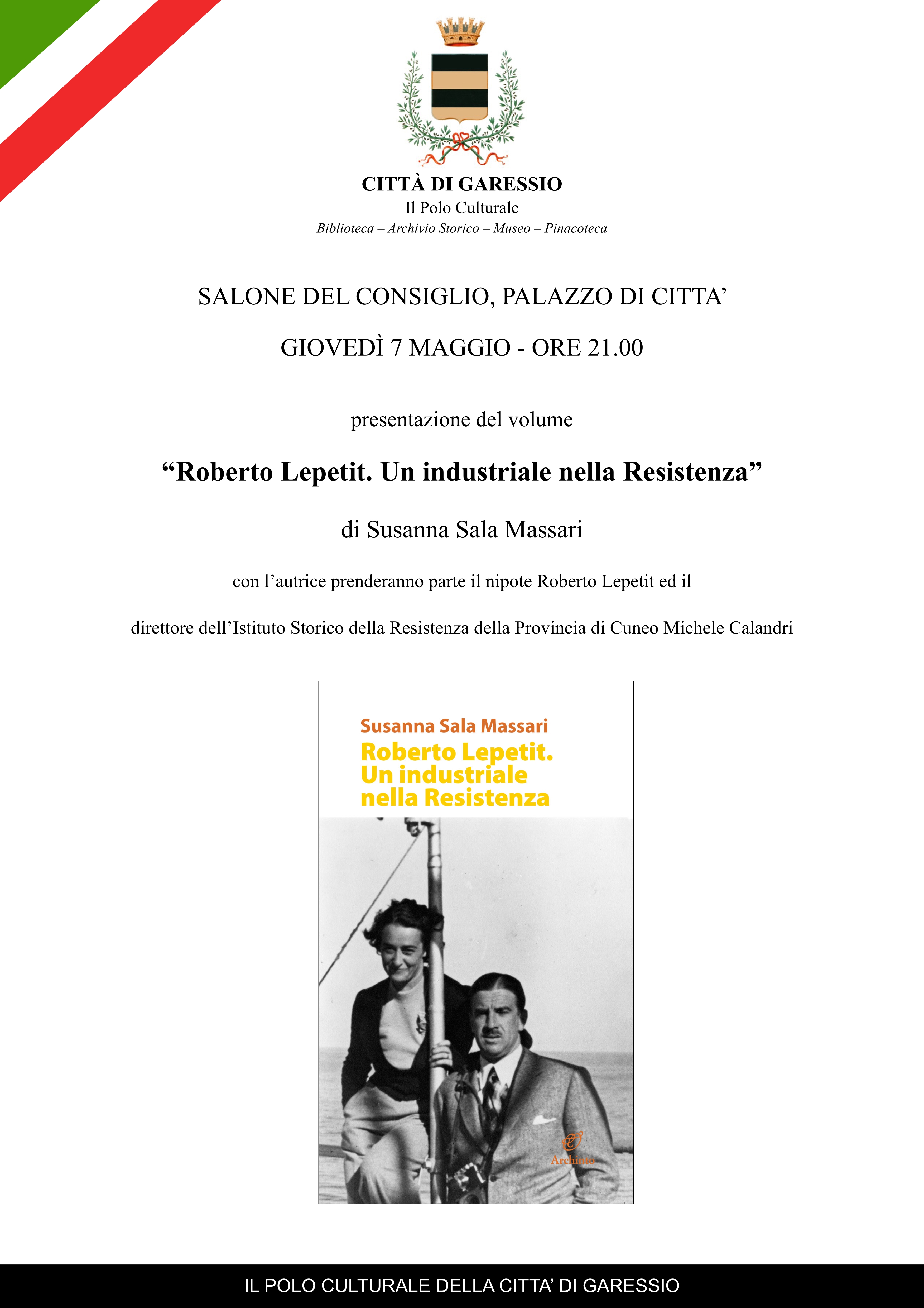 Giovedì 7 maggio 2015 alle ore 21.00 presso il Salone Consiliare del Comune di Garessio si terrà la presentazione del volume "Roberto Lepetit. Un industriale nella Resistenza" di Susanna Sala Massari.