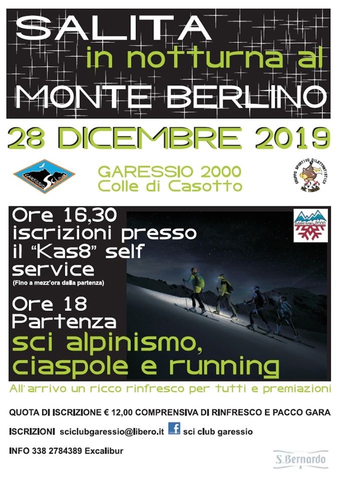 Sabato 28 dicembre 2019 presso Garessio 2000 si svolgerà la "Salita in notturna al Monte Berlino" - sci alpinismo, ciaspole e running.