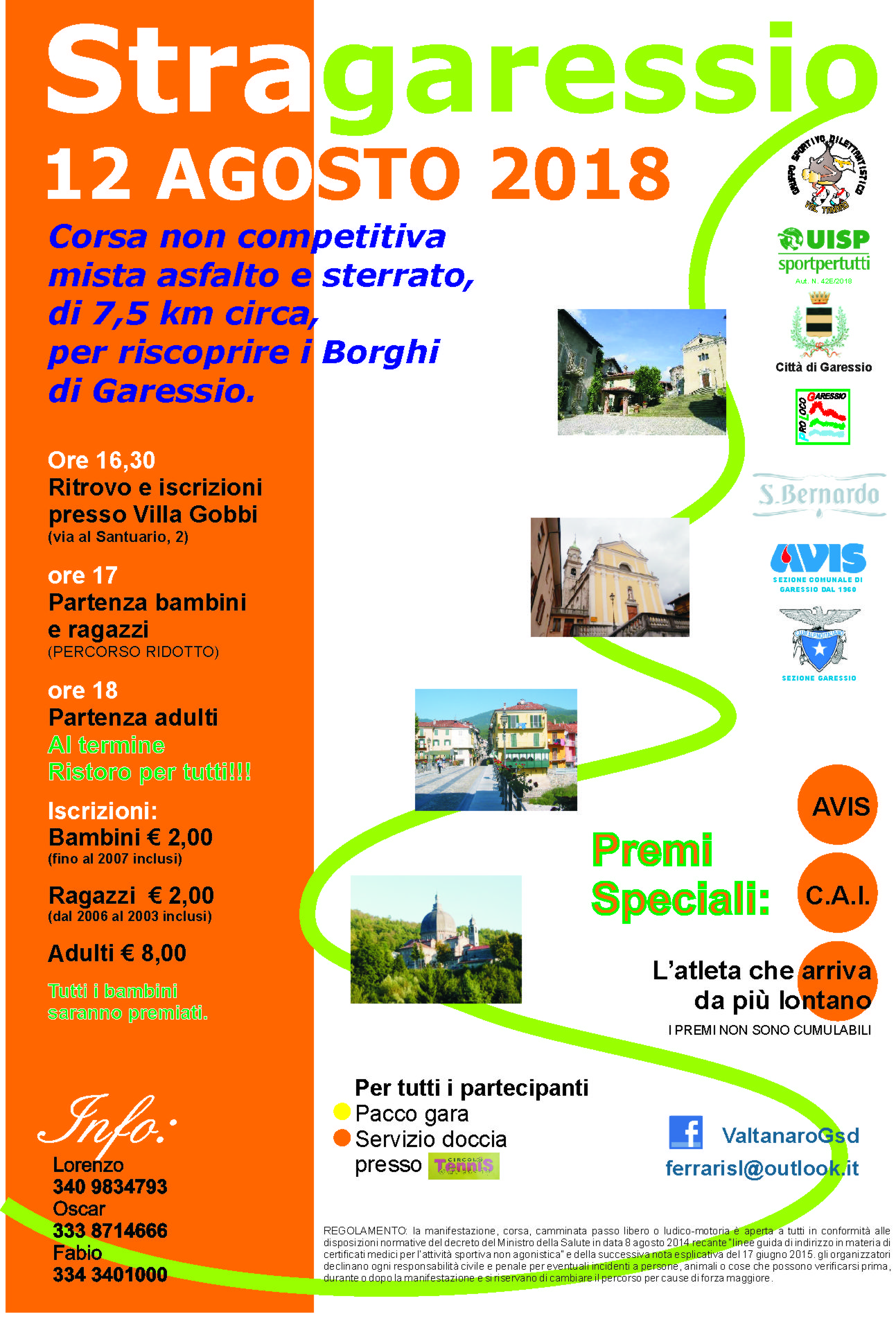 Domenica 12 agosto 2018 si svolgerà la "Stragaressio", corsa non competitiva mista asfalto e sterrato, di circa 7,50 Km, per riscoprire i Borghi di Garessio.