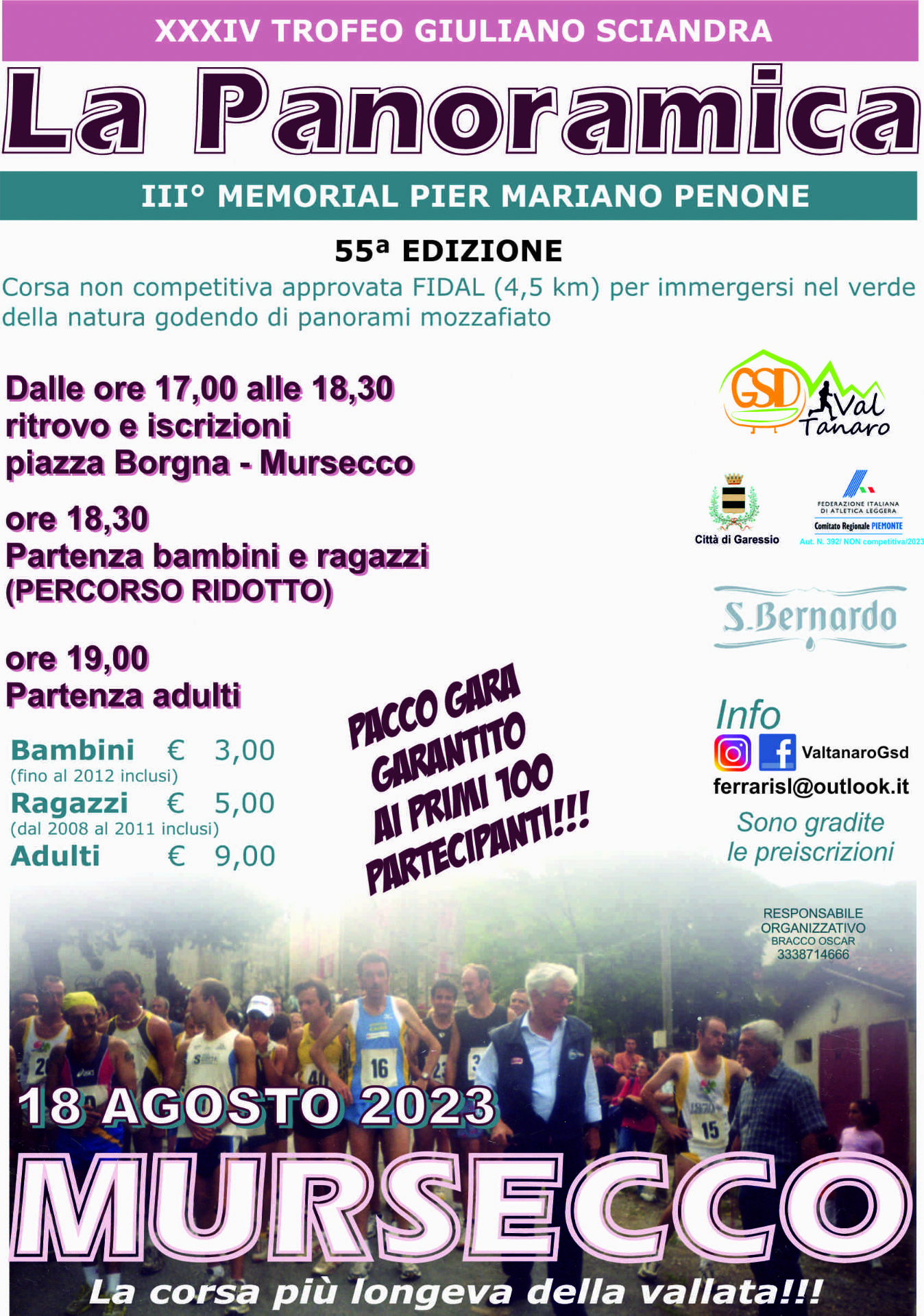 Venerdì 18 agosto 2023, a partire dalle ore 17,00, nella Frazione di Mursecco, si svolgerà la corsa podistica non competitiva "La Panoramica". XXXIV Trofeo Giuliano Sciandra. III Memorial Pier Mariano Penone.