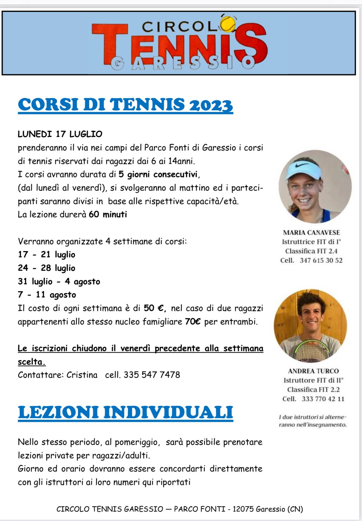 A partire da lunedì 17 luglio 2023, al mattino, presso i campi da tennis del Parco Fonti San Bernardo inizieranno i corsi riservati ai ragazzi dai 6 ai 14 anni. Nell'orario pomeridiano sarà anche possibile prenotare lezioni private per ragazzi o adulti.
