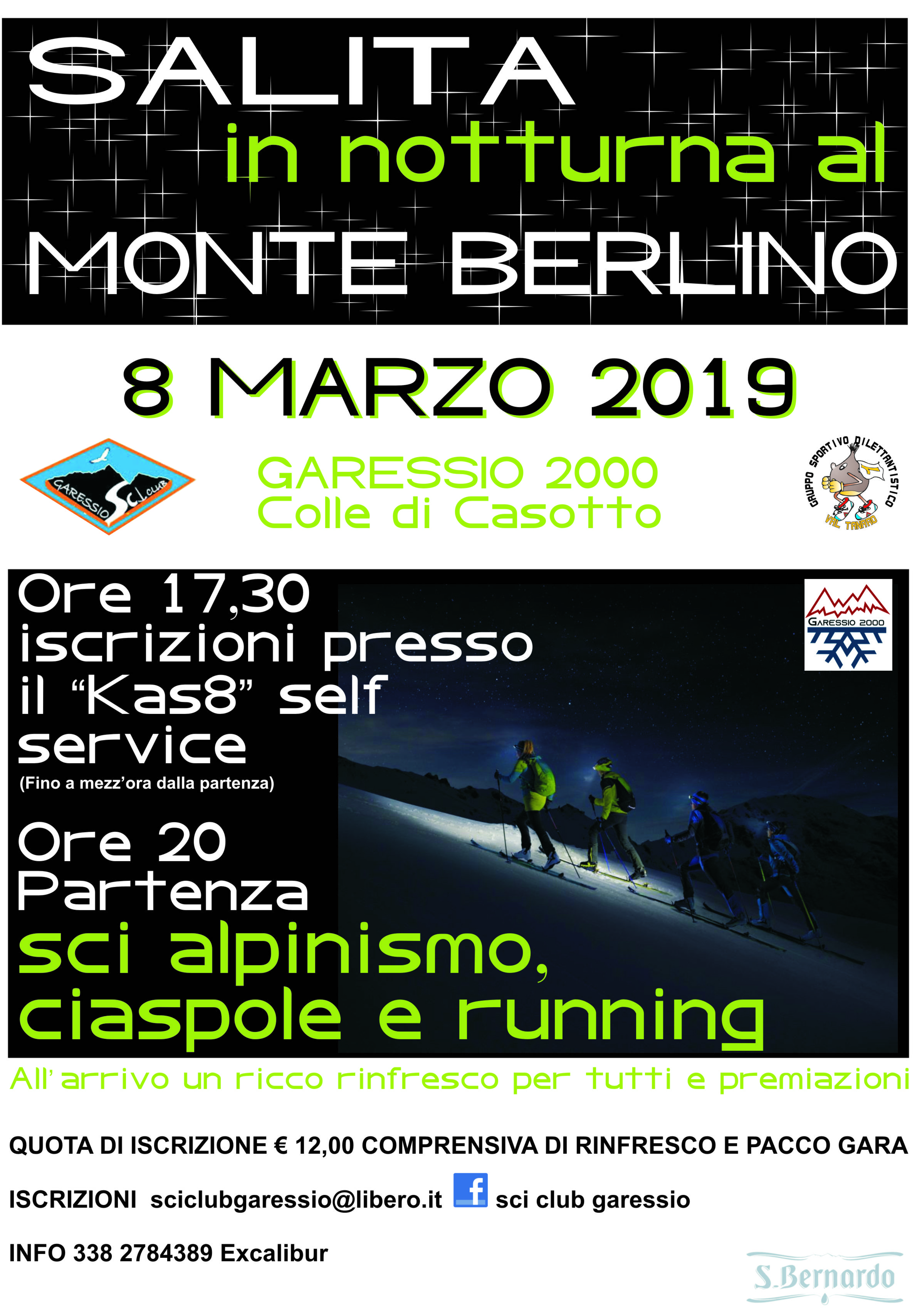 Venerdì 8 marzo 2019, a Garessio 2000, alle ore 20,00 si svolgerà la salita in notturna al Monte Berlino (sci alpinismo, ciaspole e running).