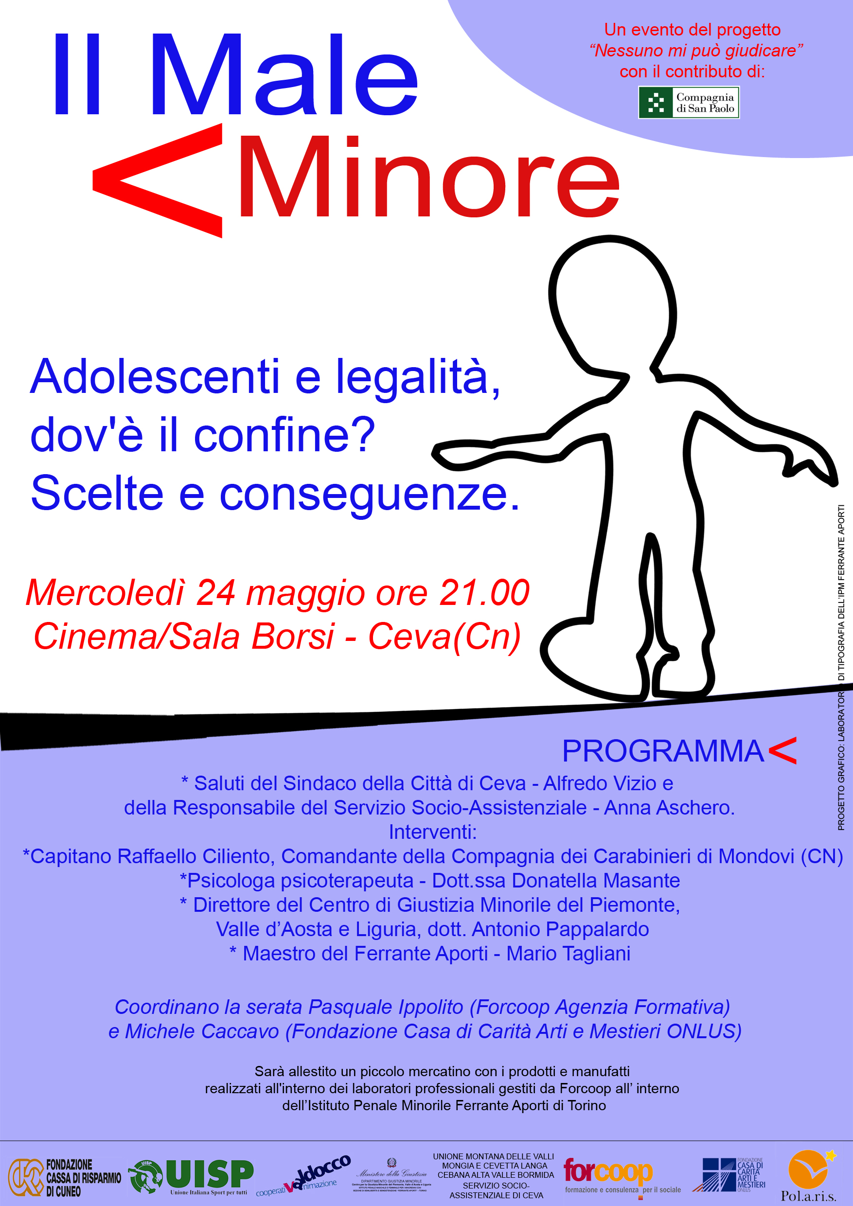 Mercoledì 24 maggio alle ore 21.00 presso la Sala Borsi di Ceva, nell’ambito del Progetto Polaris, si terrà una serata dal titolo “ IL MALE MINORE – adolescenti e legalità. Dove è il confine? Scelte e conseguenze”.