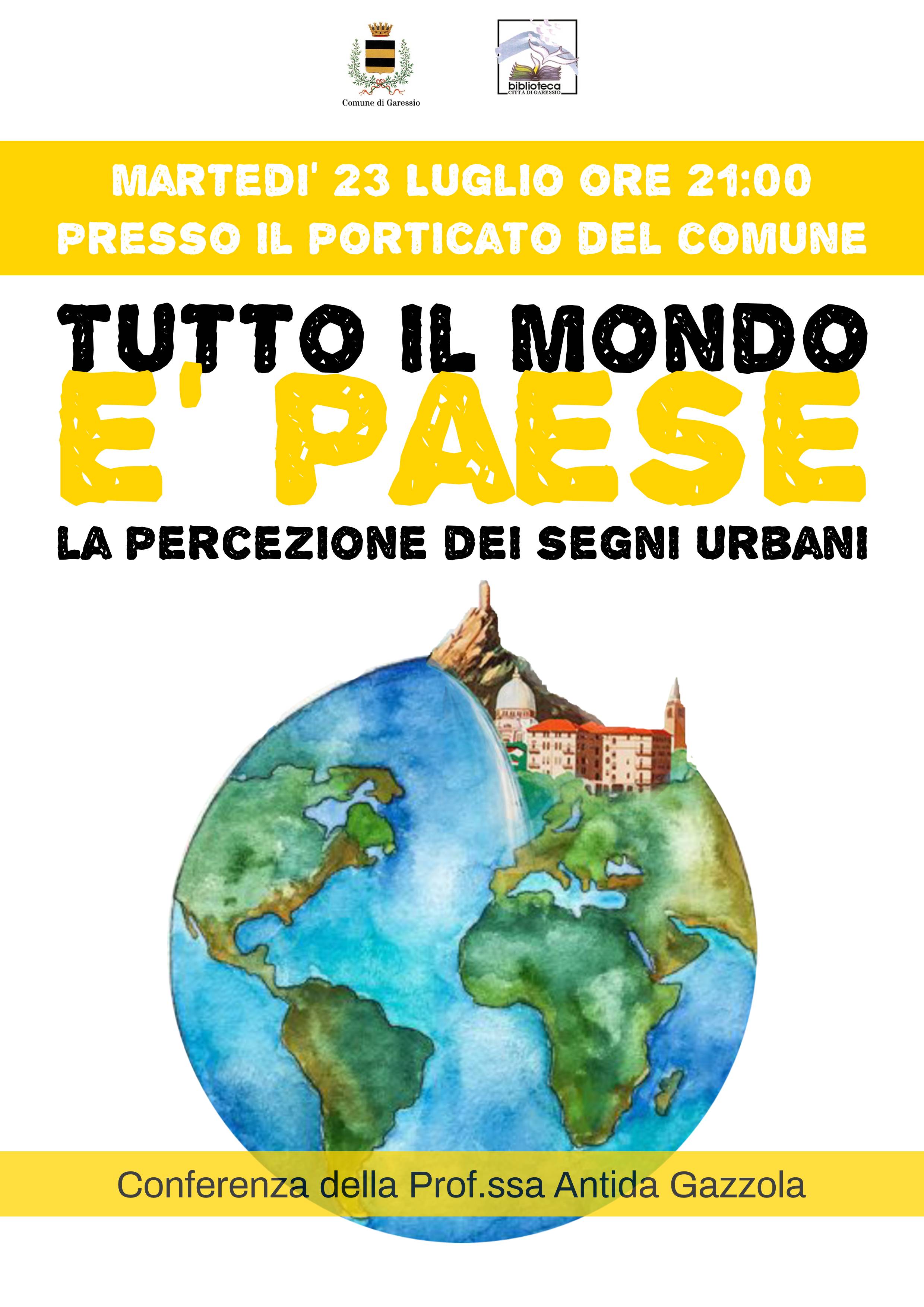 Martedì 23 luglio 2019 alle ore 21,00, presso il porticato del Comune si svolgerà la conferenza della Prof.ssa Antida Gazzola “Tutto il mondo è paese – la percezione dei segni urbani”.