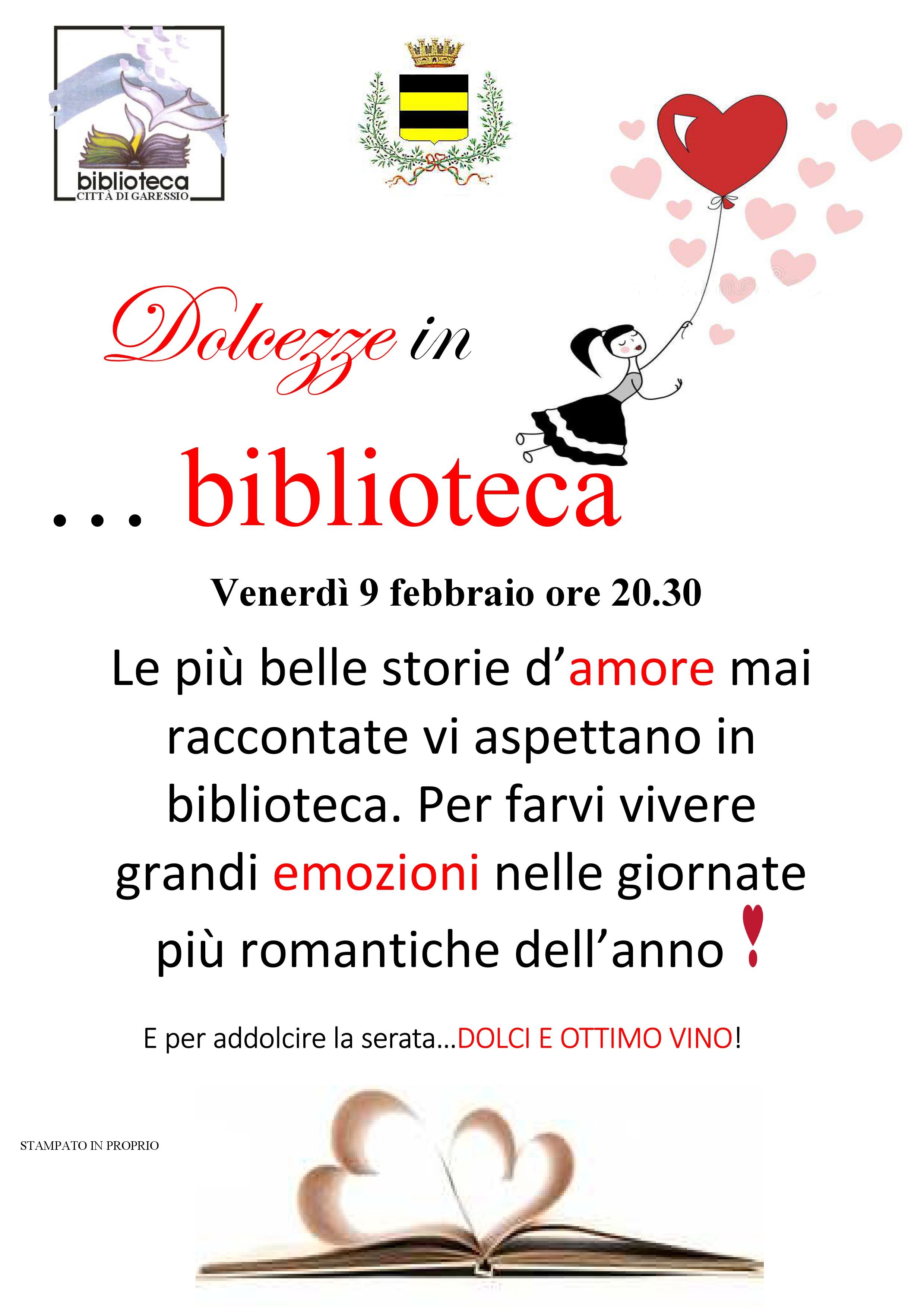 Venerdì 9 febbraio ore 20.30 la biblioteca di Garessio si tinge di rosa. Per prepararsi a San Valentino verranno proposti i romanzi d’amore più belli di sempre. Ti invitiamo a rievocare atmosfere magiche e grandi passioni nei giorni i più romantici dell’anno, leggendo o rileggendo titoli intramontabili. Per addolcire ulteriormente la serata verranno offerti deliziosi dessert e ottimo vino!