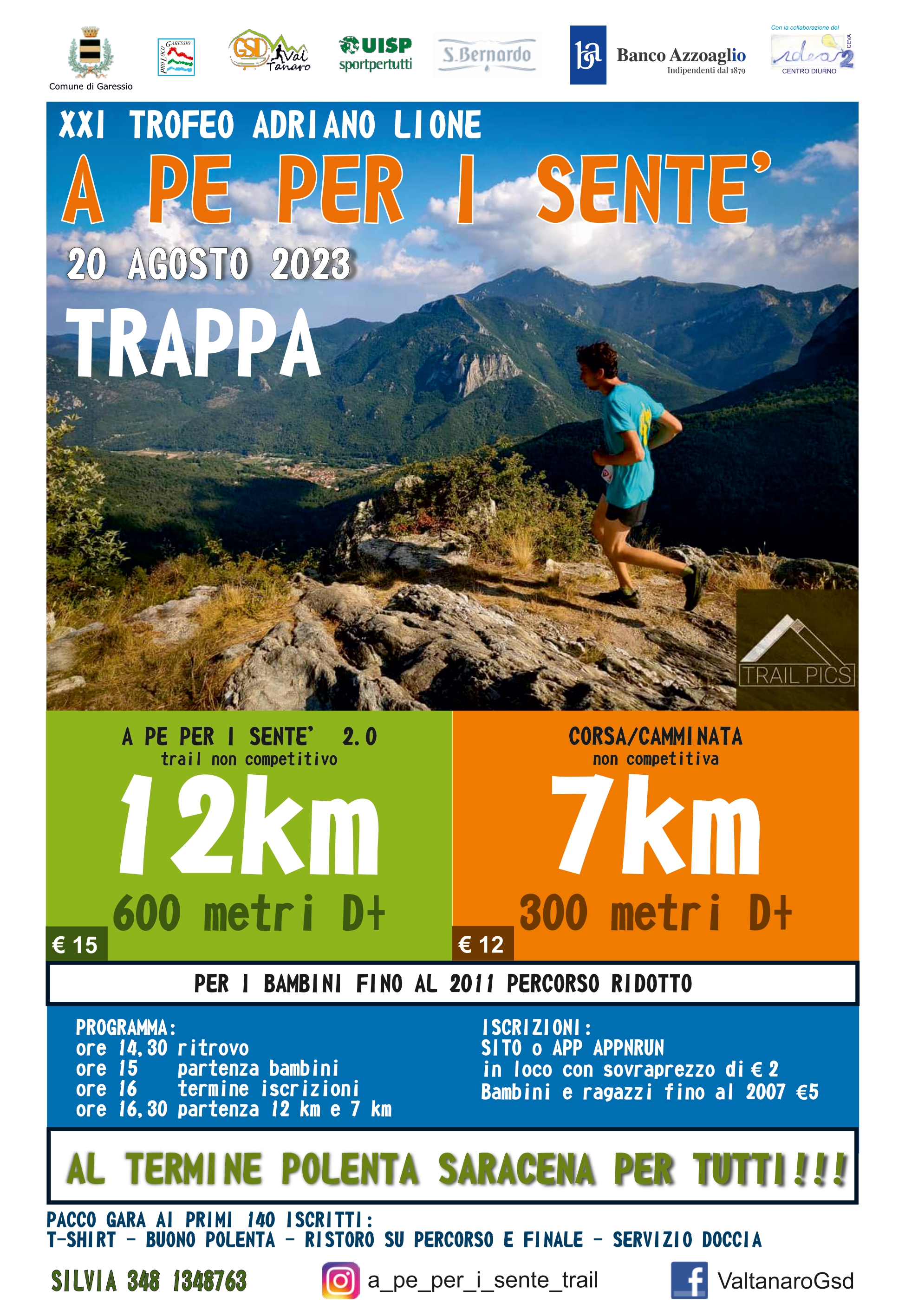 Domenica 20 agosto 2023, a partire dalle ore 14,30, nella Frazione Trappa di Garessio, corsa non competitiva: "A pe per i sente' ", polenta saracena e funzione religiosa, per la tradizionale "Festa di San Bartolomeo".