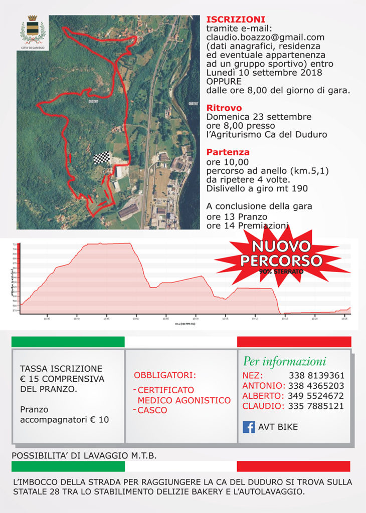 Domenica 23 settembre 2018, con ritrovo alle ore 8,00 presso l'Agriturismo Ca del Duduro e partenza alle ore 10,00, si svolgerà la 1^ tappa del giro MTB, con un percorso ad anello (km 5,1) da ripetere 4 volte.