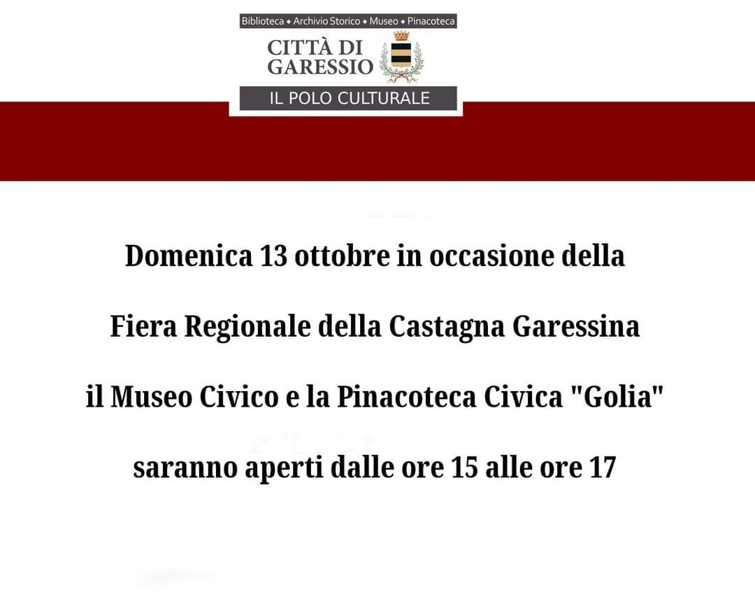 Domenica 13 ottobre, in occasione della Fiera Regionale della Castagna Garessina, il Museo e la Pinacoteca Civica "Golia" saranno aperti dalle ore 15,00 alle ore 17,00.