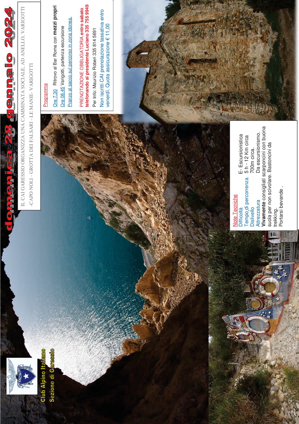 Domenica 28 gennaio 2024, con ritrovo per la partenza alle ore 7,30, presso il Bar Roma, il CAI Garessio organizza una camminata sociale, ad anello: Varigotti, Capo Noli, Grotta dei Falsari, Le Manie, Varigotti. Prenotazione obbligatoria.