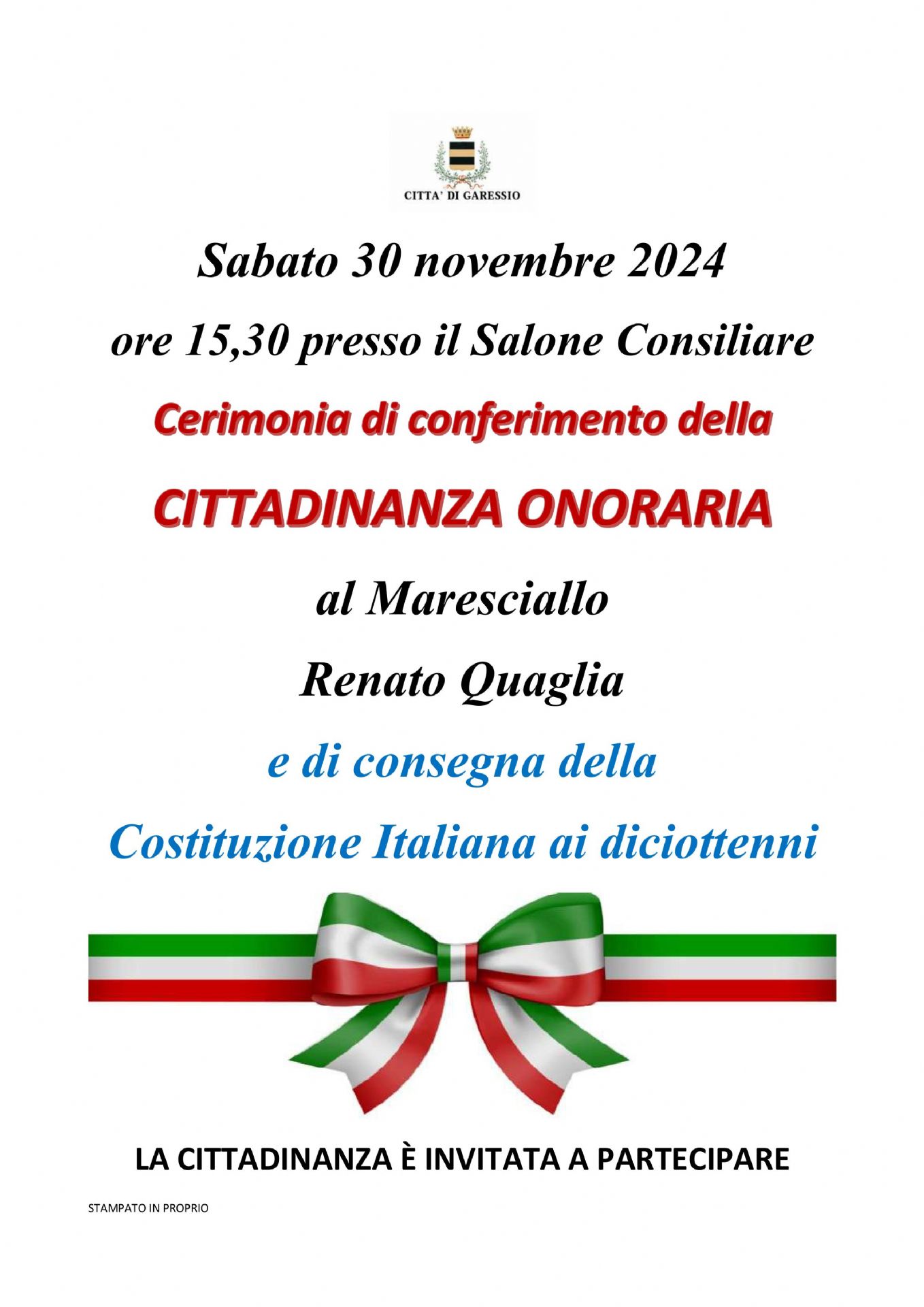 Sabato 30 novembre 2024 alle 15,30 presso il Salone Consiliare si svolgerà la cerimonia di conferimento della Cittadinanza Onoraria al Maresciallo Renato Quaglia e di consegna della Costituzione Italiana ai diciottenni.