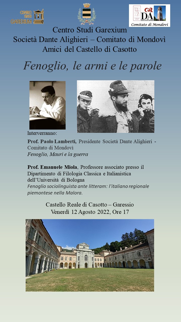 Venerdì 12 agosto 2022 alle ore 17,00, presso il Castello Reale di Casotto, si svolgerà la conferenza "Fenoglio, le armi e le parole".