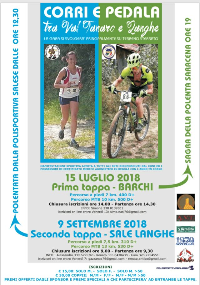 Domenica 15 luglio 2018 si svolgerà la manifestazione "Corri e pedala tra Val Tanaro e Langhe", prima tappa - Barchi, con percorso a piedi di 7 km e percorso MTB di 10 km.