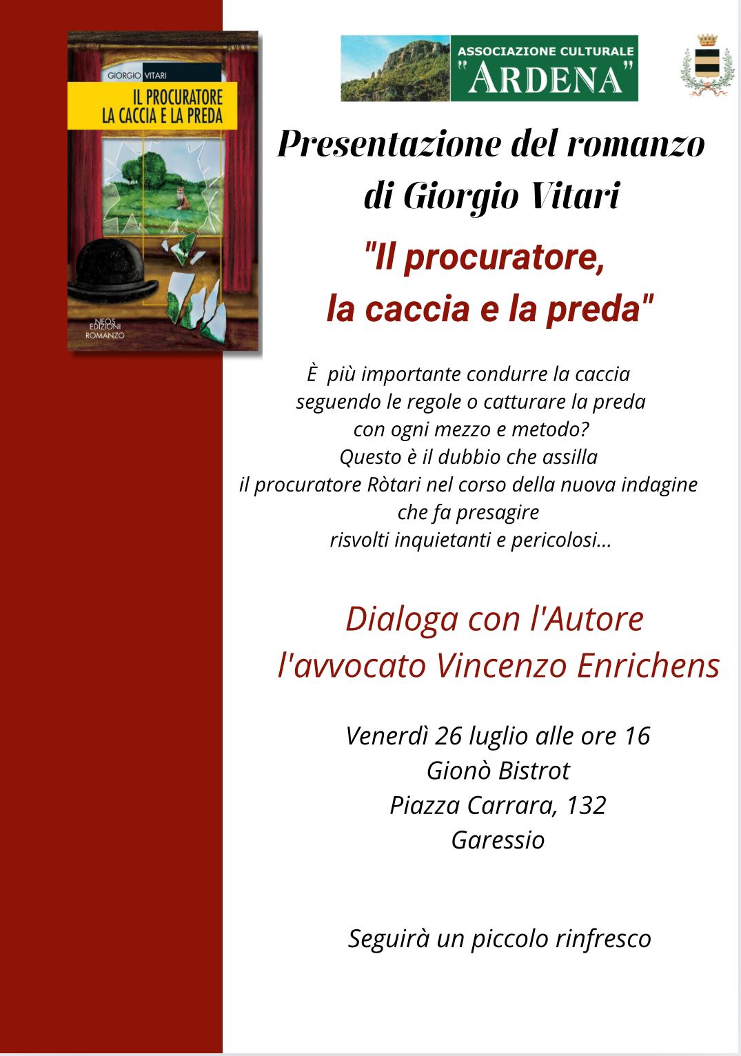 Venerdì 26 luglio 2024, alle ore 16,00, presso Gionò Bistrot, l'Associazione Culturale Ardena presenta il romanzo di Giorgio Vitari: "Il Procuratore, la caccia e la preda". (locandina allegata)