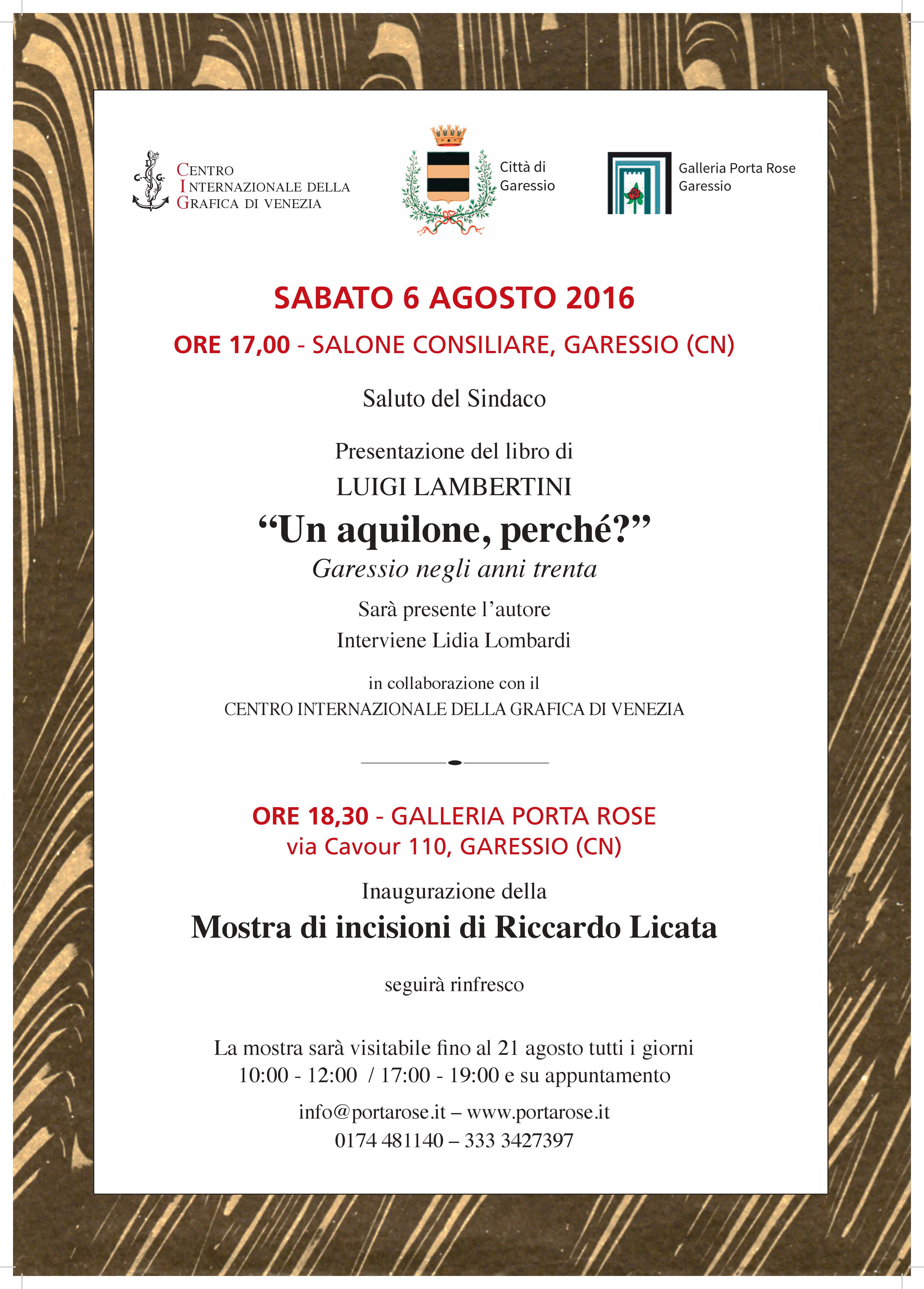 Alle ore 18,30 presso la Galleria Porta Rose verrà inaugurata la mostra di incisioni di Riccardo Licata. La mostra sarà visitabile fino al 21 agosto tutti i giorni dalle ore 10 alle 12, dalle ore 17 alle ore 19 e su appuntamento.