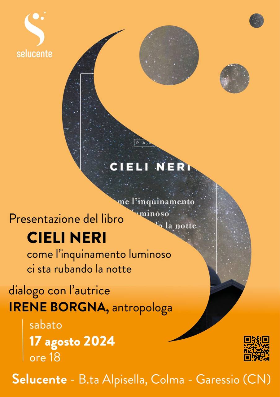 Sabato 17 agosto 2024, alle ore 18,00, presso Selucente, in Borgata Alpisella - Regione Colma di Garessio, presentazione del libro "Cieli neri", di Irene Borgna. (locandina evento allegata)
